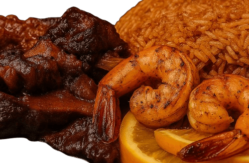 A rich and flavorful West African dish featuring tender, slow-cooked oxtails in a savory sauce, served with spicy, tomato-infused Jollof rice for the perfect hearty meal.
